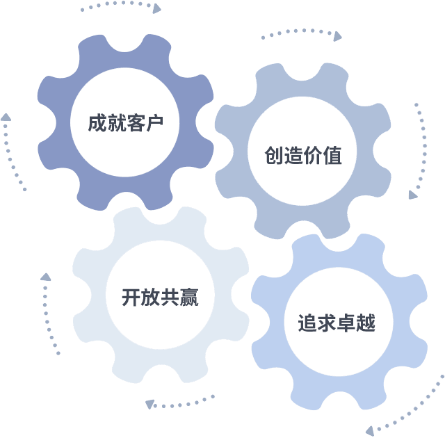 成就客户是一切决策的出发点,,创造价值是衡量所有工作的标准,,,追求卓越是我们做事做人的态度,,开放共赢是我们的格局也是最终的结果。。。。价值观的齿轮环环相扣,,推动着组织里的每个人不断向前。。。